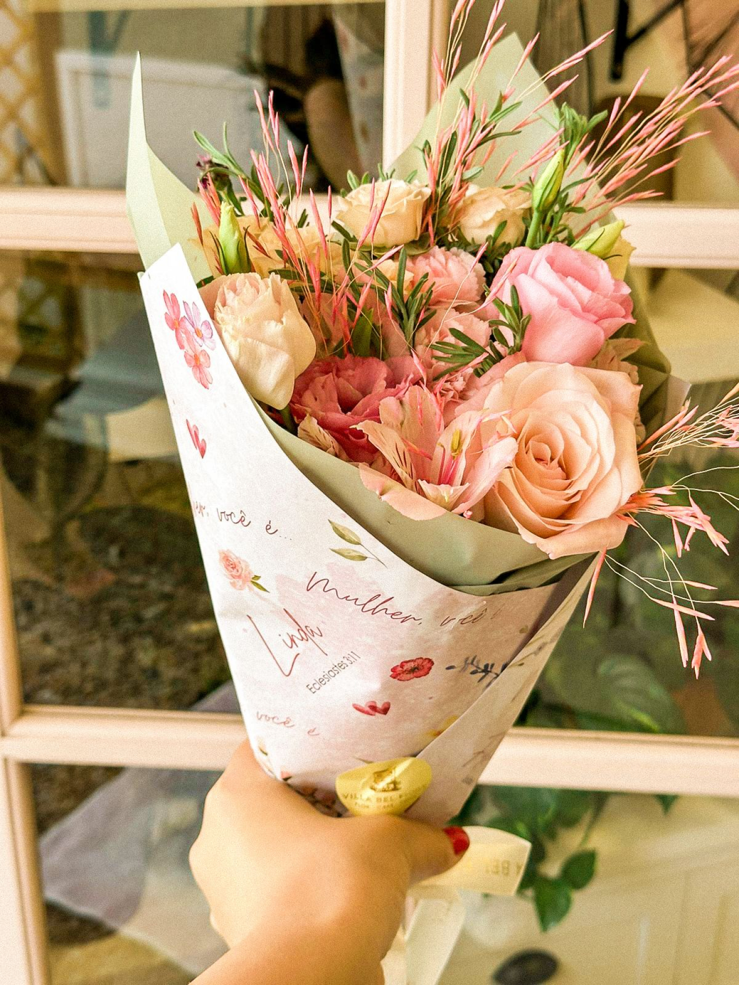 Buquê com mix de flores delicadas e papel especial com versículos sobre a MULHER! Para reforçar que ela é FILHA AMADA, VITORIOSA, LINDA, FORTE, VALIOSA, PRECIOSA! Surprenda mulheres especiais neste dia!