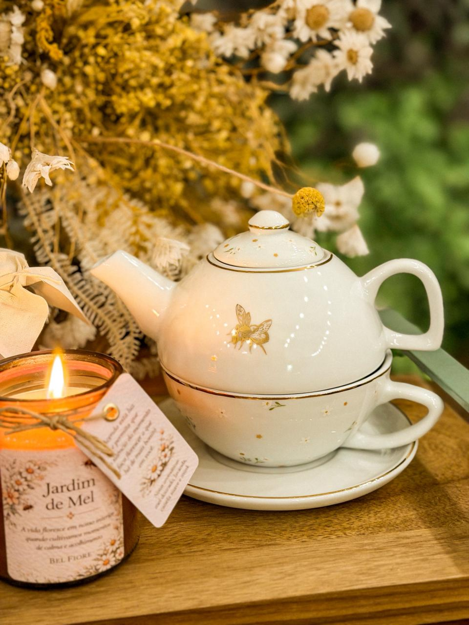 Lindo bule de porcelana, decorado com margaridas e abelha de ouro. Que este chá aqueça seu coração, acalme seus pensamentos e transforme o momento em um pequeno refúgio de paz.