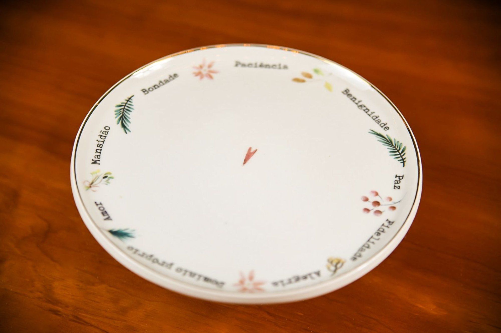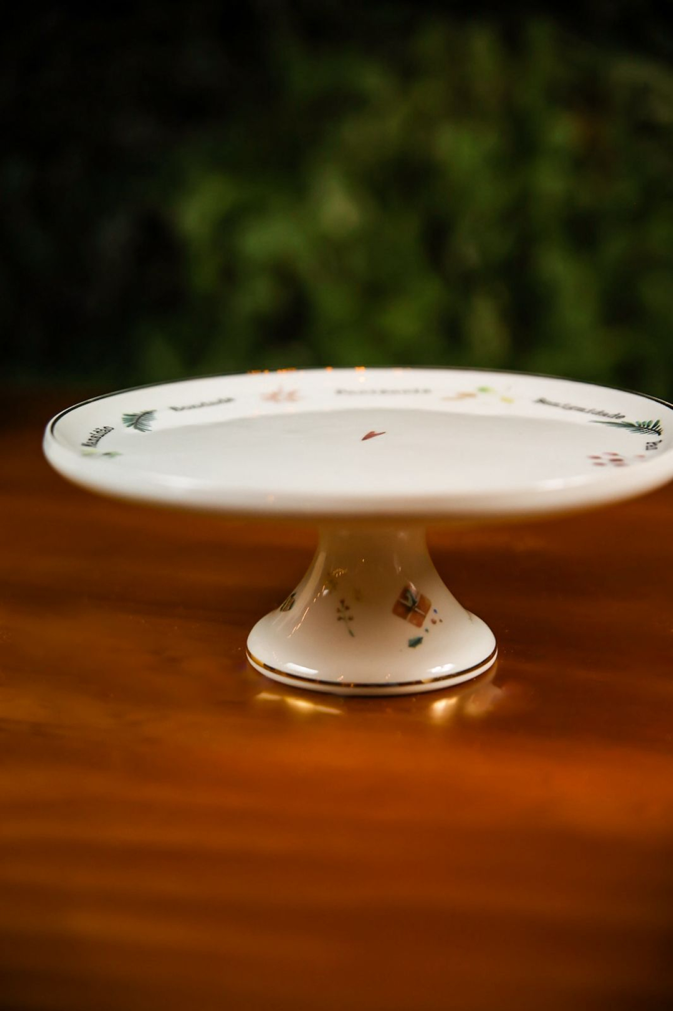 Boleira em porcelana branca com pedestal, decorada com delicadas ilustrações dos Frutos do Espírito e detalhes sutis em dourado na borda. Elegante e delicada, é ideal para servir bolos, tortas e doces, trazendo significado, charme e um toque especial à mesa nas celebrações de Natal.