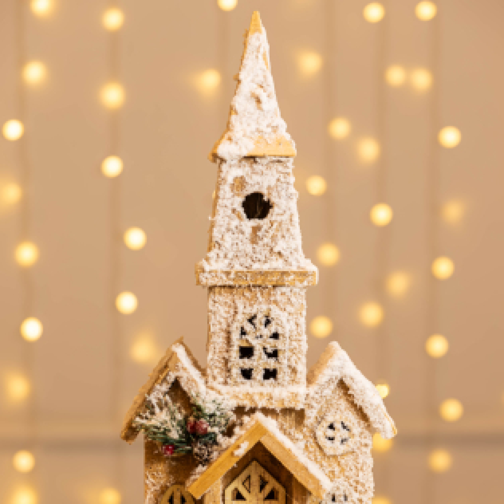 Casa decorativa feita em madeira, com delicado efeito de neve natalina que realça seus detalhes e formas. Com acabamento cuidadoso e visual encantador, a Casa Nevada traz o clima do Natal de forma elegante e aconchegante, perfeita para compor a decoração com charme e delicadeza.