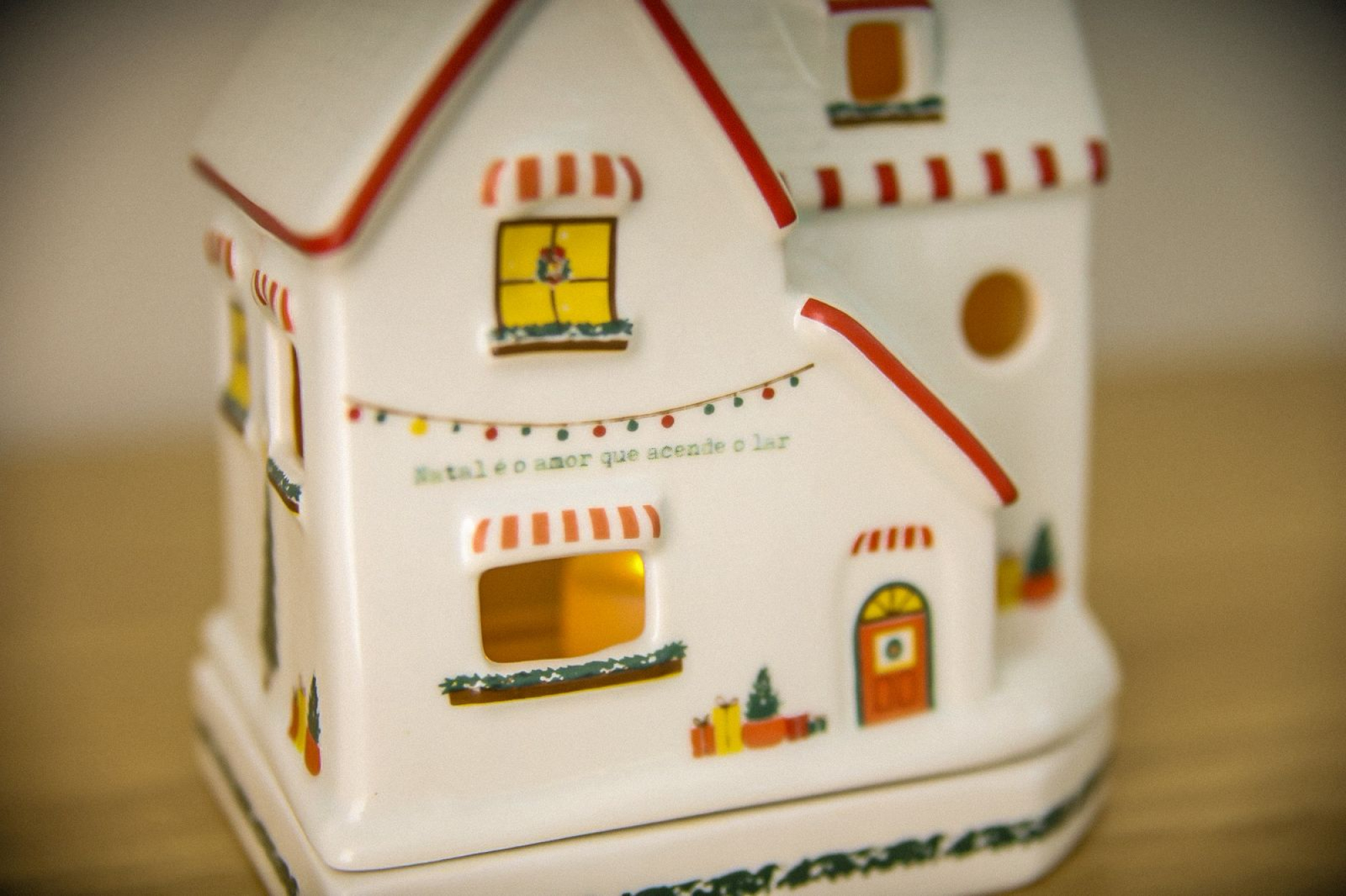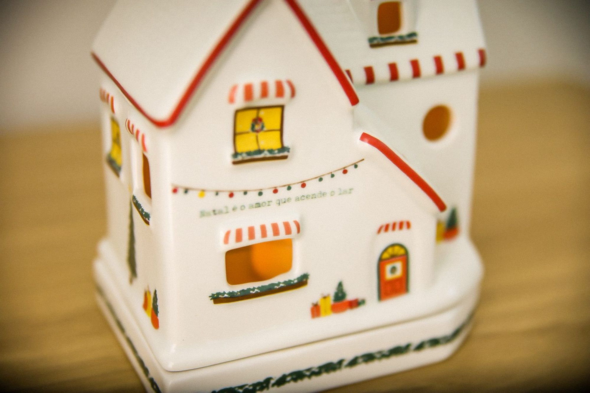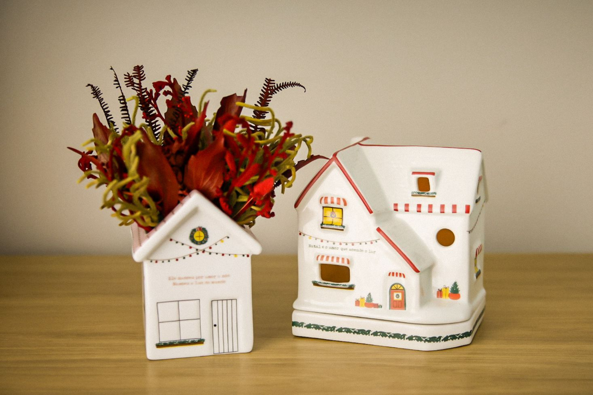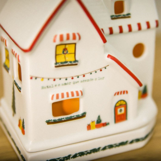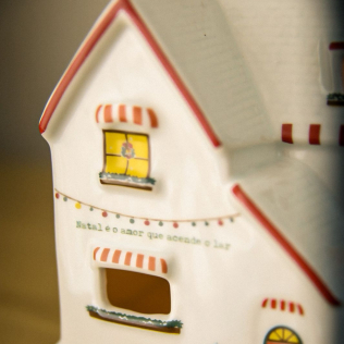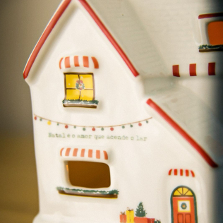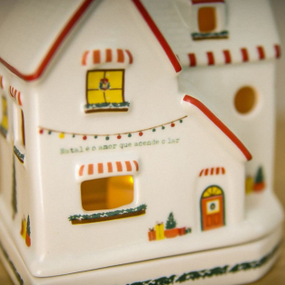 Casinha de porcelana decorativa, com janelas vazadas que permitem a colocação de uma velinhaem seu interior, criando um efeito de luz suave e acolhedor. Com tema natalino, é uma peça que ilumina o ambiente e compõe perfeitamente com a casinha de flores, trazendo ainda mais charme e significado para a decoração de Natal.