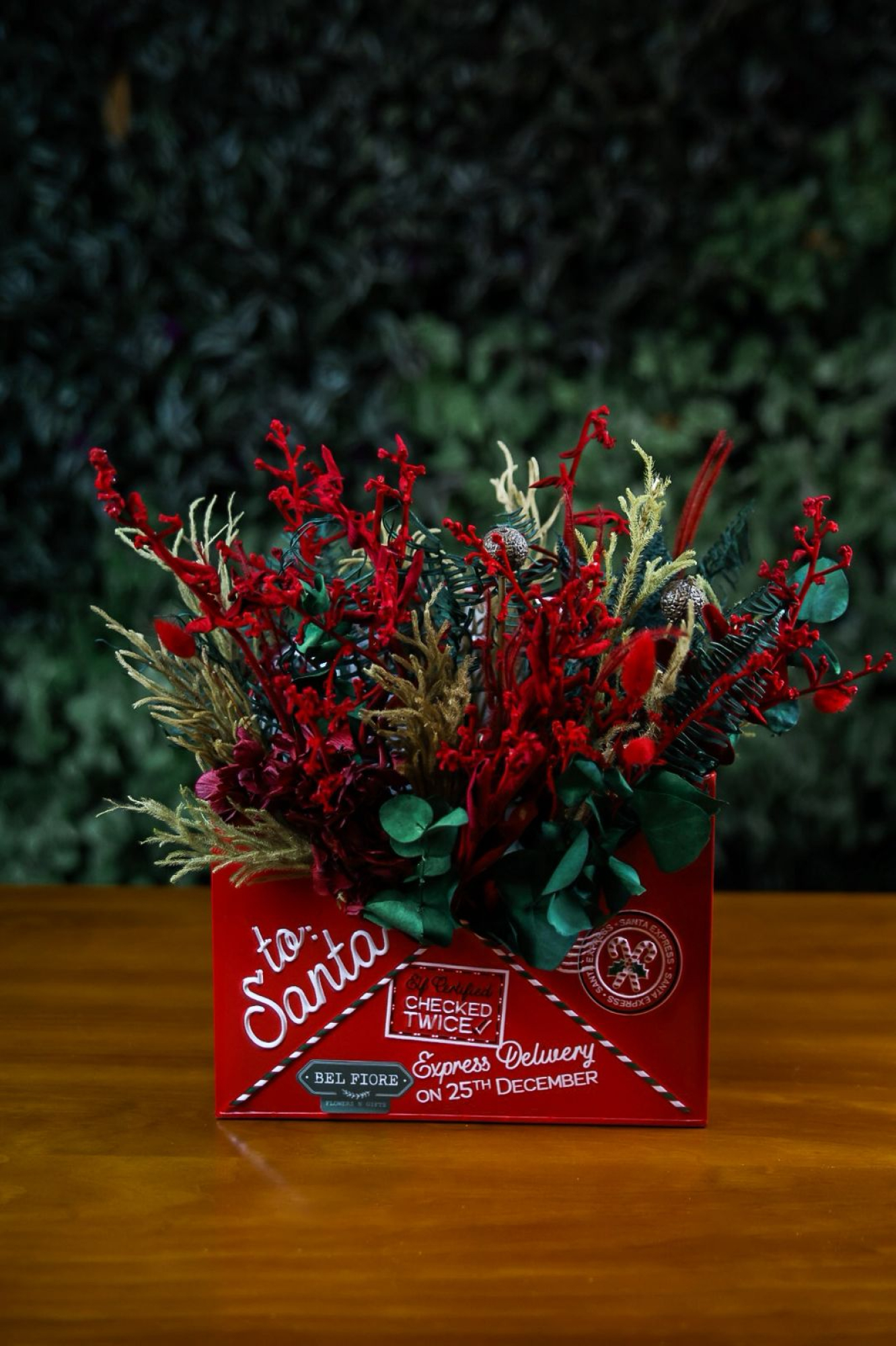 Lata decorativa em formato de envelope, cuidadosamente ornamentada com arranjo de flores desidratadas em cores natalinas. A composição harmoniza tons tradicionais do Natal com elementos delicados, resultando em uma peça charmosa e elegante, ideal para enriquecer a decoração com criatividade e beleza.