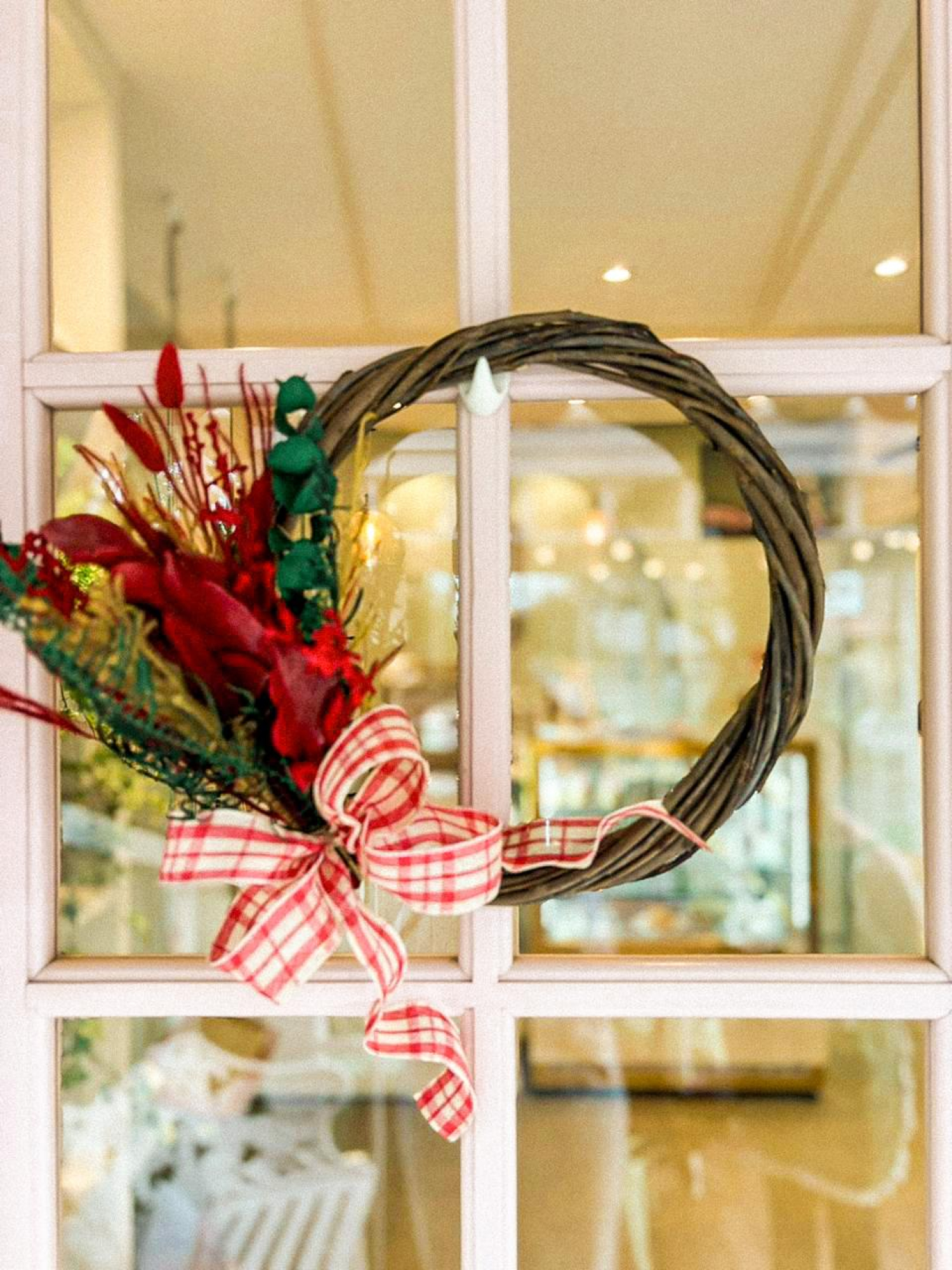 Guirlanda natalina cuidadosamente elaborada, com base harmoniosa de galhos e ricamente decorada com flores desidratadas em tons natalinos delicados e sofisticados. A composição combina folhagens desidratadas e pequenos detalhes naturais, criando um enfeite elegante, equilibrado e cheio de charme para a decoração de Natal.