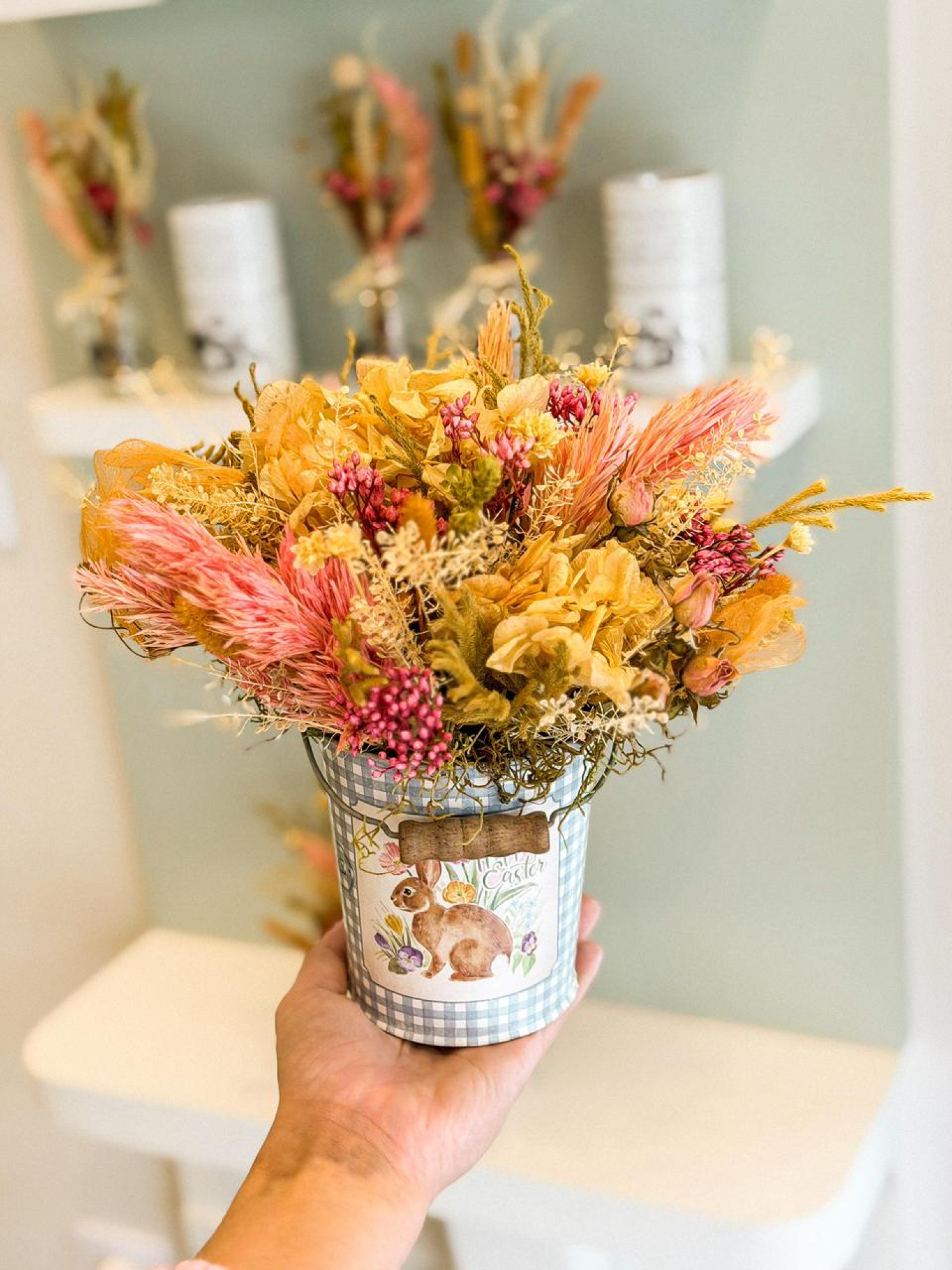 Nossa lata decorativa de Páscoa com arranjo de flores desidratadas foi criada para encantar e decorar com elegância. O arranjo é composto por uma seleção harmoniosa de flores e folhagens desidratadas, com tons suaves e naturais que trazem aconchego e sofisticação ao ambiente. A lata temática de Páscoa, com ilustração delicada de coelhinho, transforma a peça em um presente único e cheio de significado. Além de lindo, é um item durável e atemporal, perfeito para decorar mesas, aparadores ou presentear alguém especial nesta época tão doce do ano.