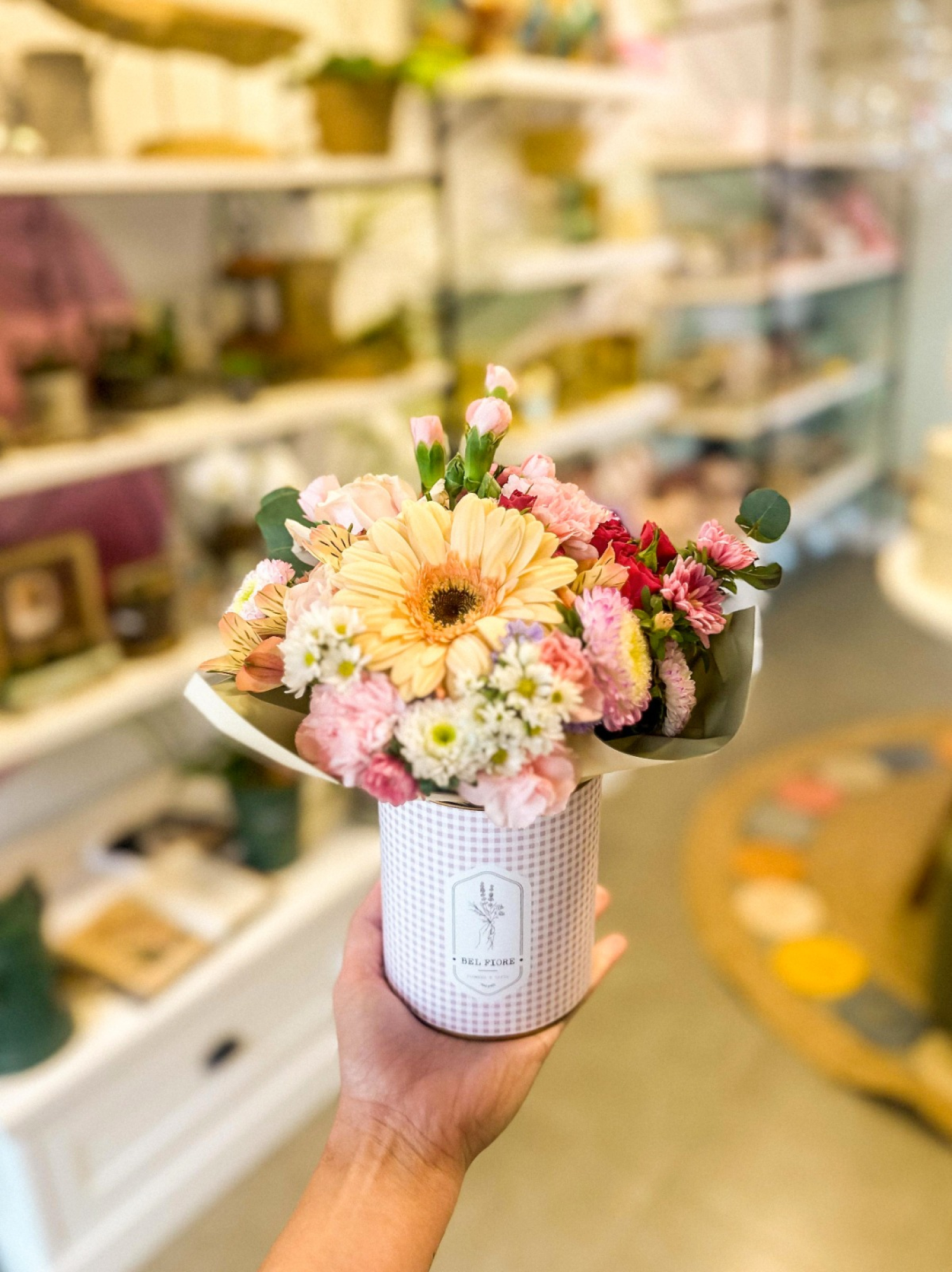 Arranjo de flores na lata Bel Fiore, escolha entre tons alegres ou neutros!