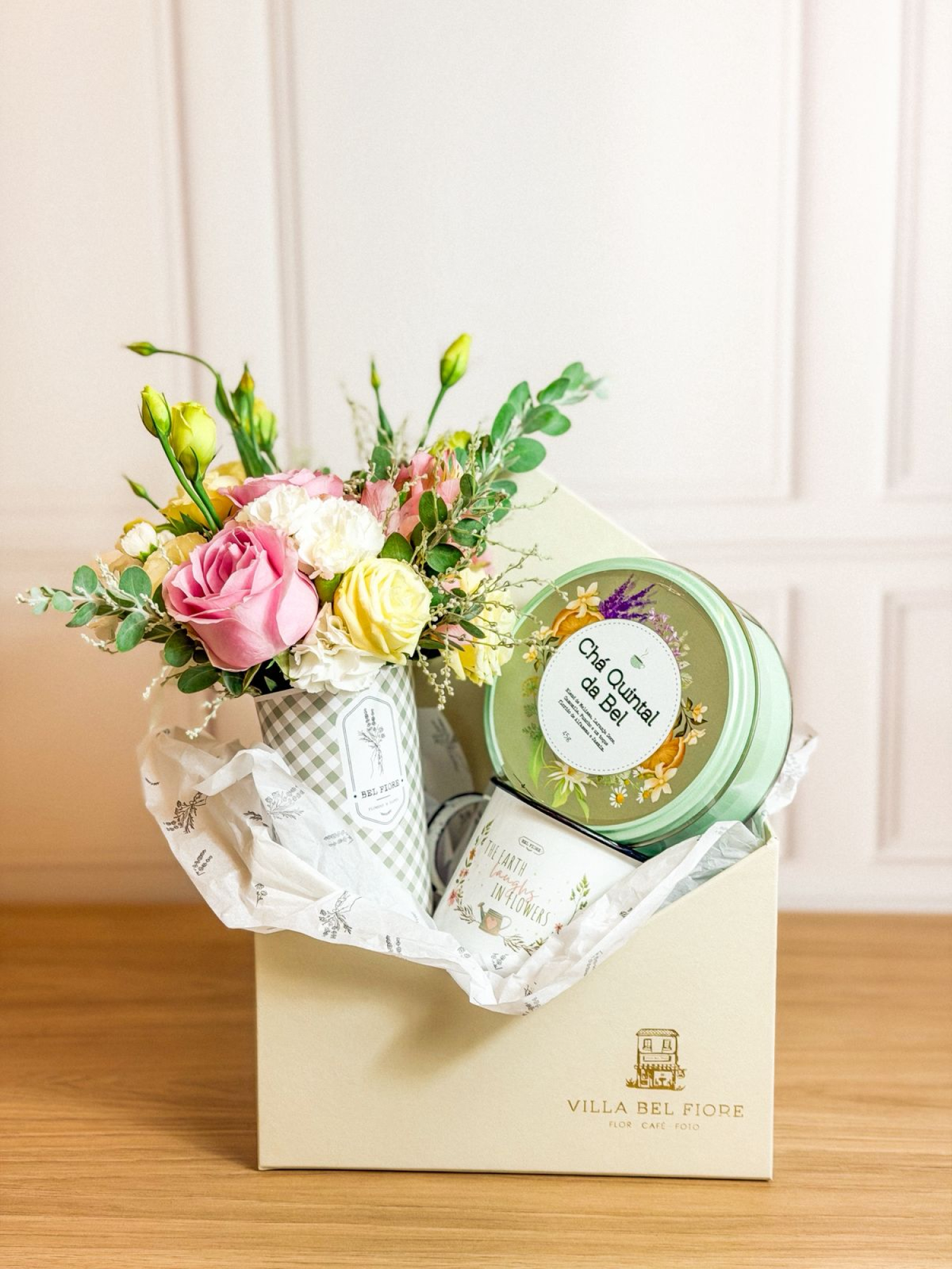 Uma linda box com mini buque de flores no cone, caneca esmaltada e uma lata de chá Quintal da Bel com blend de ervas. Um delicioso chá para pausar e relaxar!