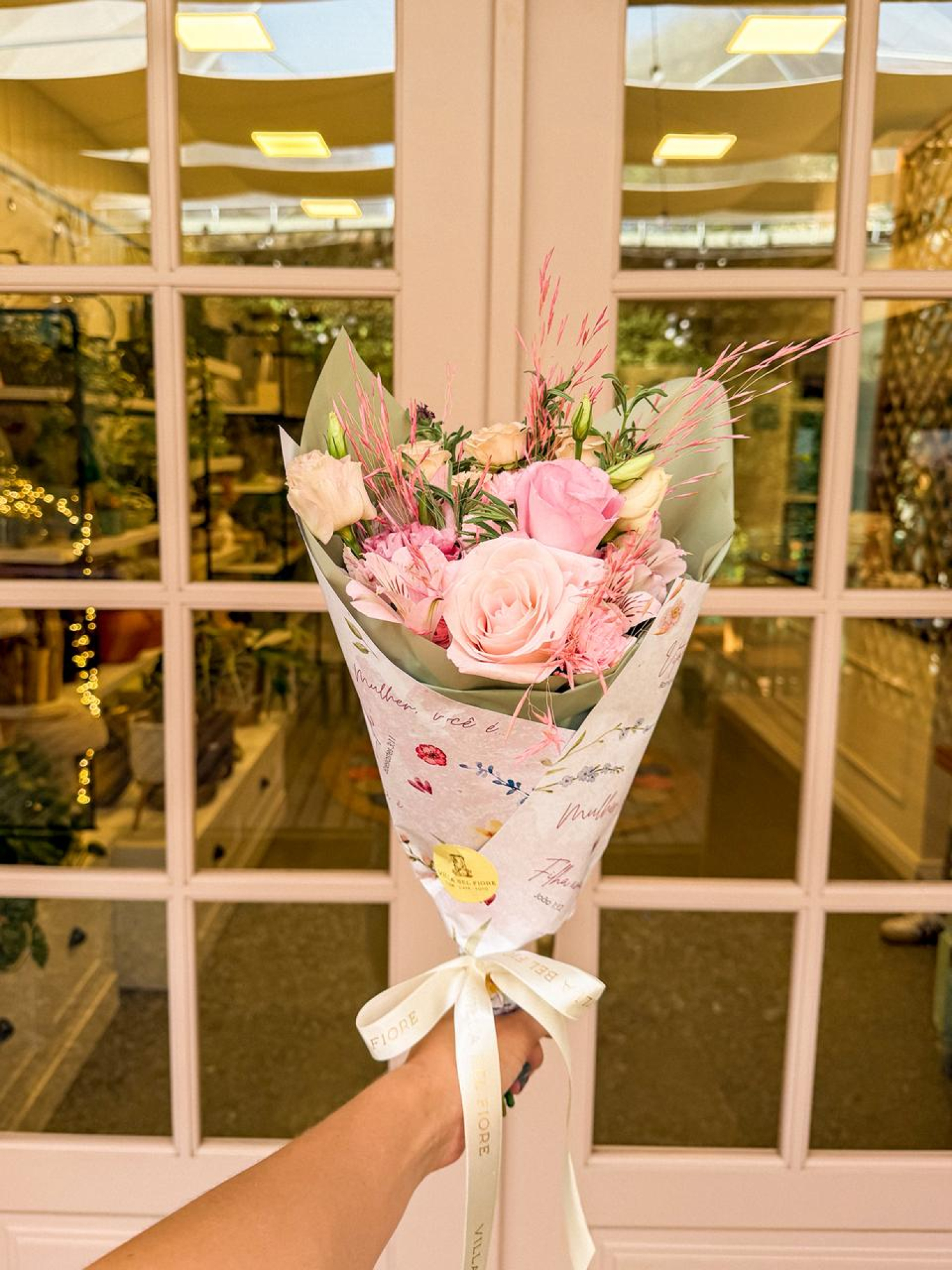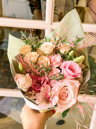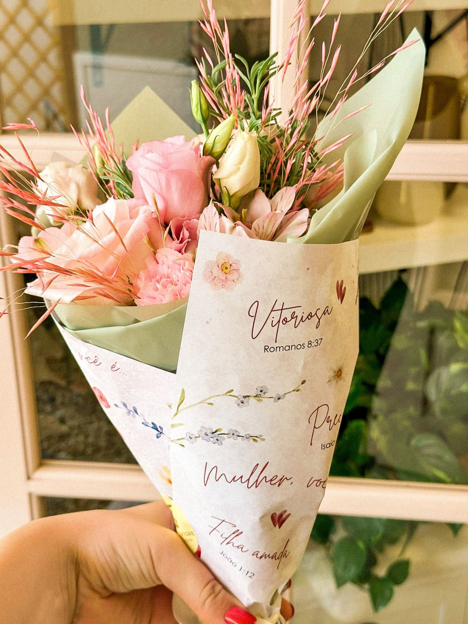 Buquê com mix de flores delicadas e papel especial com versículos sobre a MULHER! Para reforçar que ela é FILHA AMADA, VITORIOSA, LINDA, FORTE, VALIOSA, PRECIOSA! Surprenda mulheres especiais neste dia!