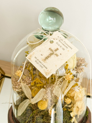 Uma delicada cúpula de vidro com flores desidratadas em tons suaves, perfeita para celebrar a Páscoa com charme e significado. Com um toque artesanal e elementos naturais, é um presente duradouro que simboliza renovação e carinho, ideal para encantar e decorar qualquer ambiente.