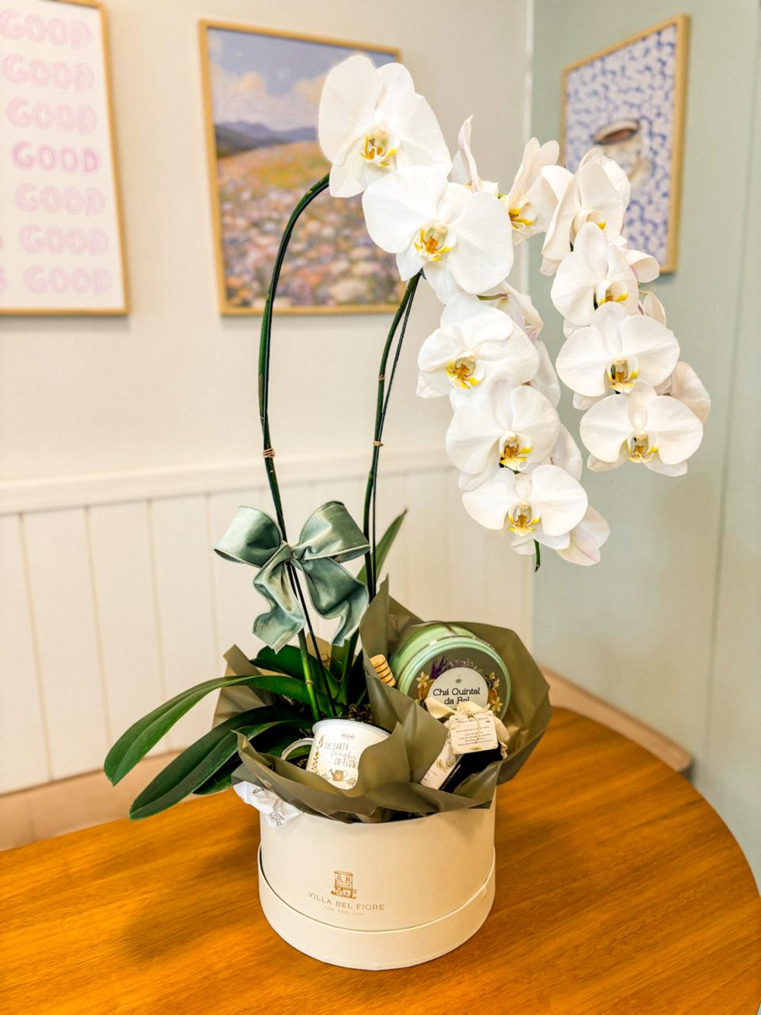 Box redonda com uma linda orquidea cascata, composta com um lata de chá Quintal da Bel, caneca esmaltada, mel orgânico e pegador mel! Uma linda opção para presentear!